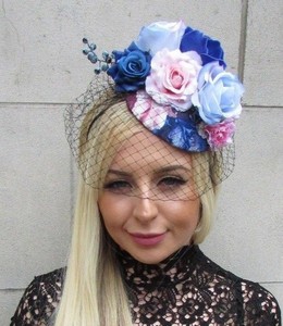 Royal Blue Rose Birdcage Veil light pink fascinator hat