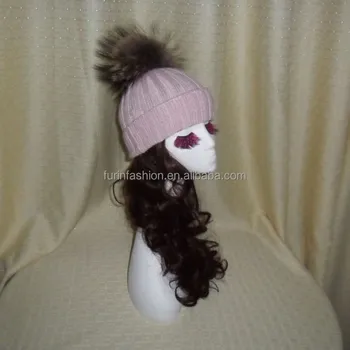 Wool Beanie Hats With Raccoon Fur Ball hat with fur ball on top