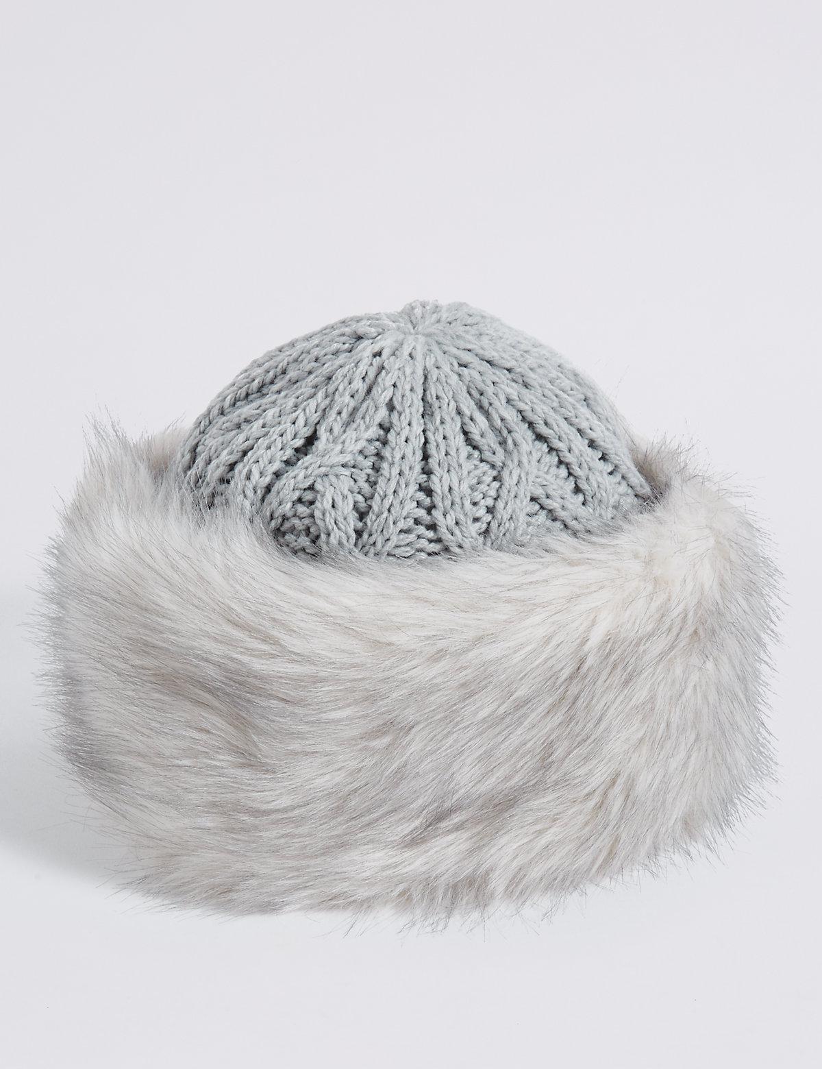 Faux Fur Cable Knit Winter Hat in Grey marks and spencer fur hat