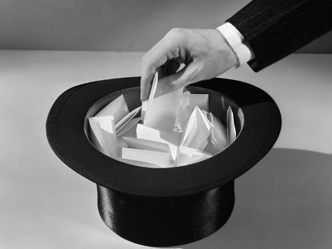 Hand in Top Hat Full of Paper Pulling name out of a hat