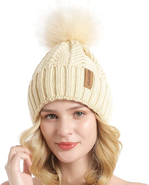 QUEENFUR Winter Beanie for Women Knit womens winter hat with fur pom pom